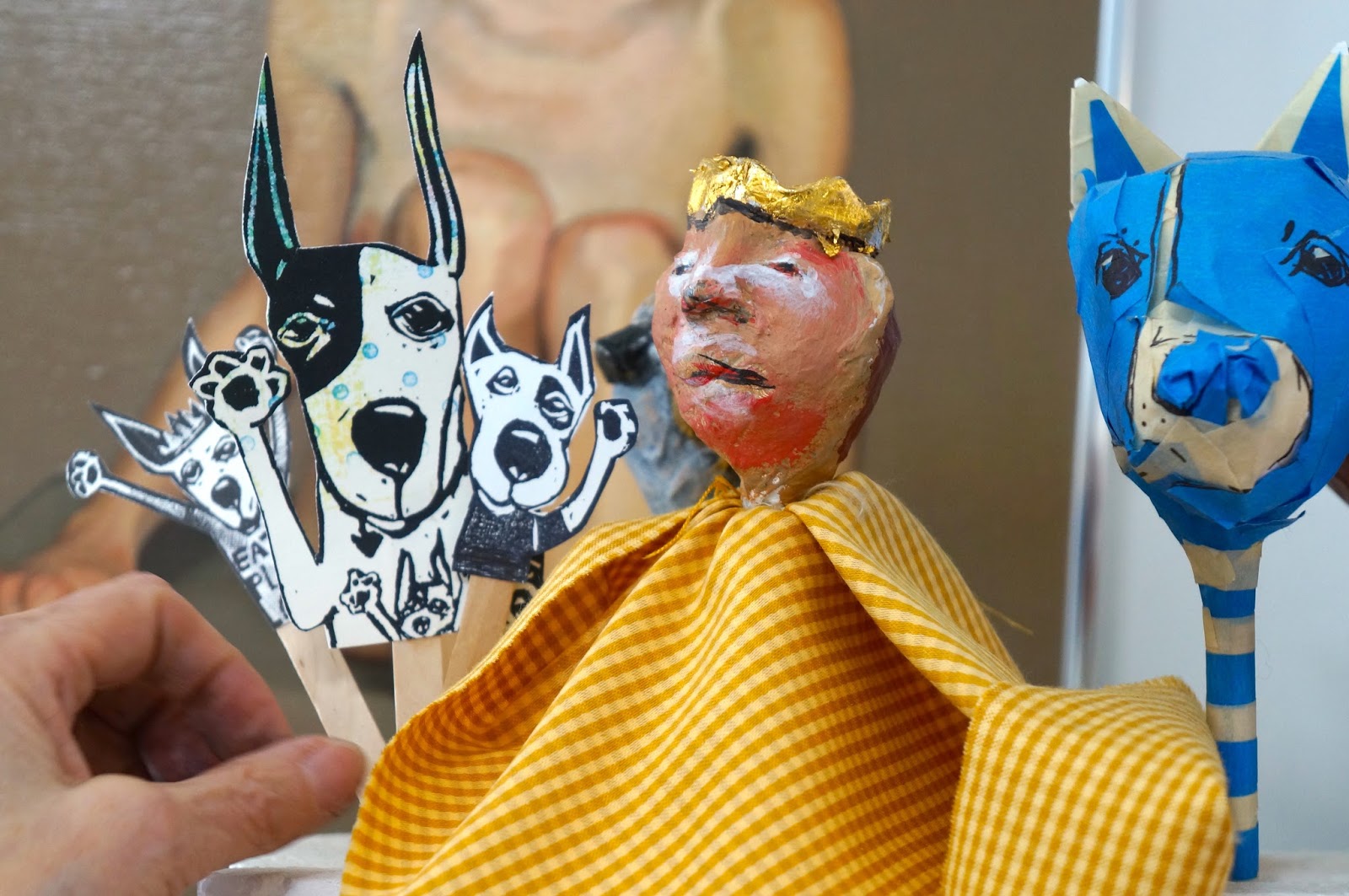 SR: How did they start? Oh, I know. We kept throwing out sponge brushes (James laughs in the background) and I thought it was so wasteful. So I started making puppets out of them. I start with a sponge brush and I put Reynolds wrap around it and then I tape it. And I tape newspaper and then modge podge I build it up.